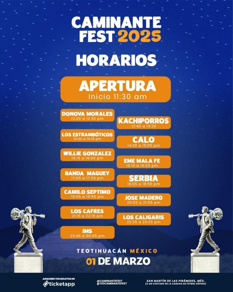 El Caminante Fest 2025 está a la vuelta de la esquina, y los organizadores han liberado los horarios oficiales para que puedas planear tu día en este festival.El 1 de marzo, Teotihuacán te recibe con un cartel de primer nivel que reúne a José Madero, Los Caligaris, Camilo Séptimo, Los Cafres, Los Estrambóticos, Serbia, Willie González, Banda Maguey, IMS y más. Además, el evento ofrecerá amenidades como lucha libre, skatepark y una variada oferta gastronómica.Desde las 11:30 a.m., la jornada arrancará con una serie de presentaciones que cubrirán un amplio espectro de géneros musicales.