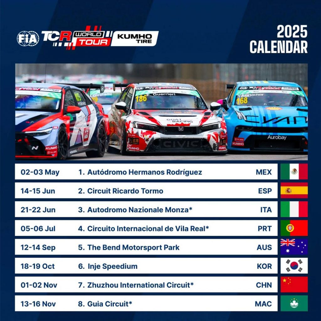 El presidente de WSC, Marcello Lotti, dijo: «Estamos orgullosos del calendario 2025 que llevará el Kumho FIA TCR World Tour a dos nuevos países: México y Corea del Sur. Estamos sumamente agradecidos con OMDAI FIA México y su presidente Jorge Abed, quienes hicieron posible reanudar una antigua y exitosa amistad y también agradecemos a nuestros accionistas coreanos Kumho y Hyundai por sus esfuerzos.”